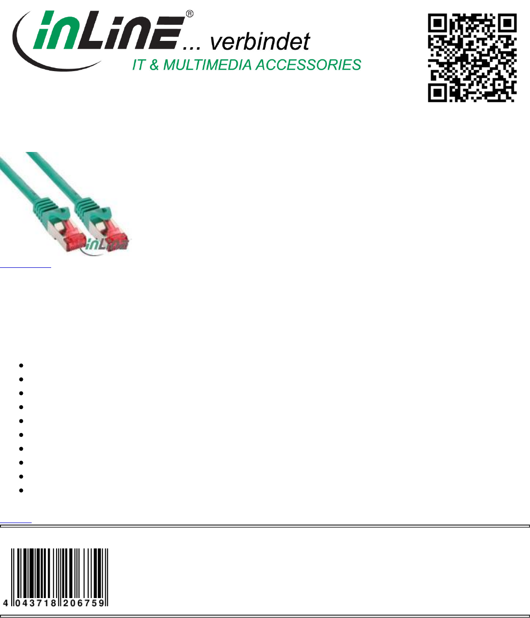 InLine® Patch cable S/FTP (PiMf), Cat.6, halogen free, green, 7.5m